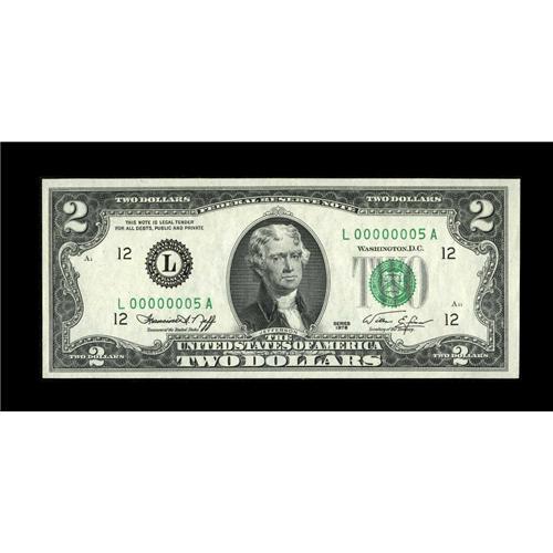 <B>Fr. 1935-L $2 1976 Federal Reserve Note. Choice Crisp Uncirculated.</B></I><BR>Another example which would make a good mate to the note above. This original beauty is graced with serial number five.<BR><BR><b>Shipping:</b> Coins & Currency (<a target="_blank" href="http://www.heritageauctions.com/common/shipping.php">view shipping information</a>)