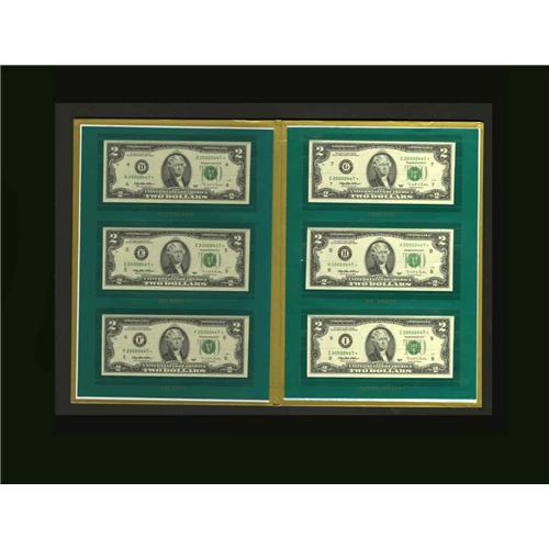 <B>Premium Millennium Federal Reserve $2 Set Fr. 1936-A*-L* $2 1995 Federal Reserve Notes. Choice Crisp Uncirculated.</B></I> All twelve of these Stars have serial number 20000447* and this limited BEP product quickly sold out. This is one of the lower serial numbers we have seen for this set. Each of the twelve notes have a thin transparent stain along the top margin. Speculation is that the stains are oil from a cutting blade within the Western Currency Facility. This phenomena is a common occurrence for these sets. Production was limited to 2,000 sets and only the F* was made for general circulation.