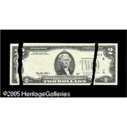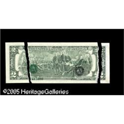 <B>Fr. 1936-F $2 1995 Federal Reserve Note. Choice About Uncirculated.</B></I> This is a wild Deuce error that had its large center portion torn free and flipped, thereby receiving the third printing mostly on the flipped center portion in an upside down manner. Also, some of the serial number and a sliver of the Treasury seal were printed on the right-hand slice correctly. Lot:15439
