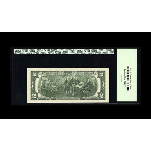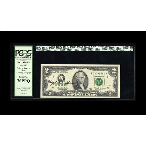 <B>Fr. 1936-F* $2 1995 Federal Reserve Note. PCGS Perfect New 70.</B></I><BR>This otherwise unremarkable Series 1995 $2 note which is autographed by Mary Ellen Withrow above her printed signature is the first and so far only PCGS graded note we have seen or catalogued to receive the ultimate grade of "Perfect New 70." We simply don't have a good handle on the real value of items such as this, although we do note that a PCGS Superb Gem 69 $2 1963 Legal star (a note normally worth about $35 on a good day) sold in our last sale for just under $1000. What is perfection worth? This note will help to define that number. Our best guess is...