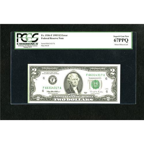 <B>Fr. 1936-F $2 1995 Federal Reserve Note. PCGS Superb Gem New 67PPQ.</B></I><BR>A light green offset is seen in the left margin. Errors on $2 FRN's do not happen with regularity.<BR><BR><b>Shipping:</b> Coins & Currency (<a target="_blank" href="http://www.heritageauctions.com/common/shipping.php">view shipping information</a>)