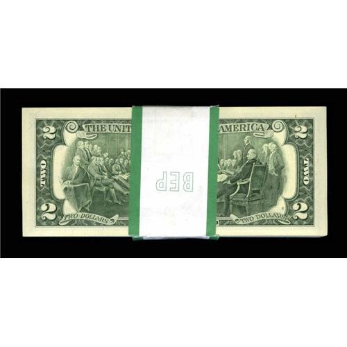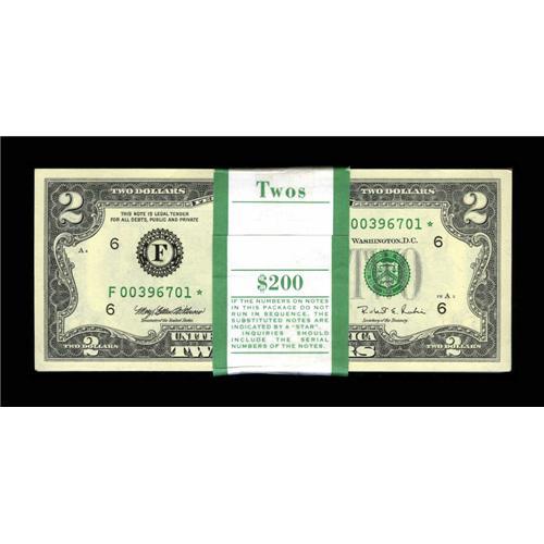 <B>Fr. 1936-F* $2 1995 Federal Reserve Notes. Original Pack of 100 Gem Crisp Uncirculated.</B></I><BR>For being the only replacement released for general circulation there are not many packs around. This one is a beauty with little handling and excellent margins.<BR><BR><b>Shipping:</b> Coins & Currency (<a target="_blank" href="http://www.heritageauctions.com/common/shipping.php">view shipping information</a>)