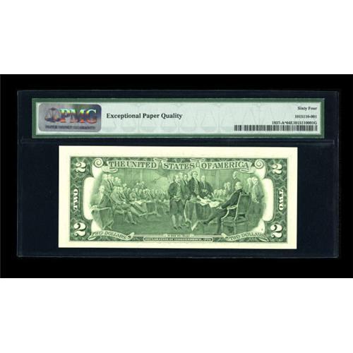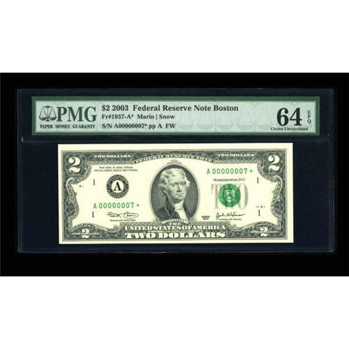 <B>Fr. 1937-A* $2 2003 Federal Reserve Note. PMG Choice Uncirculated 64 EPQ.</B></I><BR> The BEP sold the first 2000 notes from this Series in district sets containing matching serial numbers. This piece is from the seventh set and is a highly desirable piece with Serial Number A00000007*.<BR><BR><b>Shipping:</b> Coins & Currency (<a target="_blank" href="http://www.heritageauctions.com/common/shipping.php">view shipping information</a>)