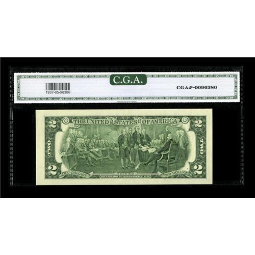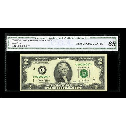 <B>Fr. 1937-C* $2 2003 Federal Reserve Note. CGA Gem Uncirculated 65.</B></I><BR>This now makes the third single digit example we have offered.<BR><BR><b>Shipping:</b> Coins & Currency (<a target="_blank" href="http://www.heritageauctions.com/common/shipping.php">view shipping information</a>)