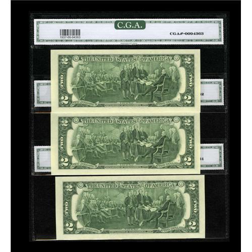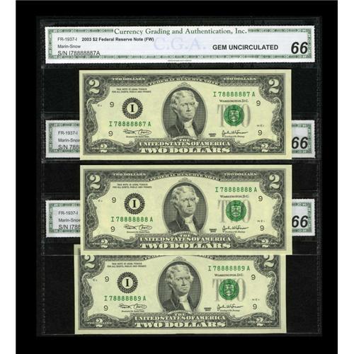 <B>Fr. 1937-I $2 2003 Federal Reserve Notes. Crazy Eights Three Examples CGA Gem Uncirculated 66.</B></I><BR>This lot contains a radar, seven 8's in a row and a ladder type note.