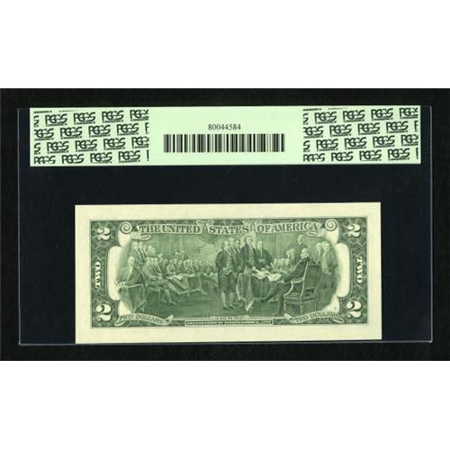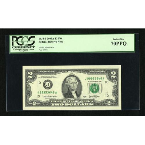 <B>Fr. 1938-J $2 2003A Federal Reserve Note. PCGS Perfect New 70PPQ.</B></I><BR> The serial number of this note starts with three "9's" telling us that this note originally came from an uncut sheet. Monster margins lead this note to the "70" promised land.<BR><BR><b>Shipping:</b> Coins & Currency (<a target="_blank" href="http://www.heritageauctions.com/common/shipping.php">view shipping information</a>)