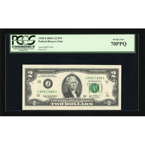 <B>Fr. 1938-J $2 2003A Federal Reserve Note. PCGS Perfect New 70PPQ.</B></I><BR> Cut from a sheet to generate the huge margins seen. <BR><BR><b>Shipping:</b> Coins & Currency (<a target="_blank" href="http://www.heritageauctions.com/common/shipping.php">view shipping information</a>)