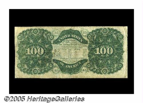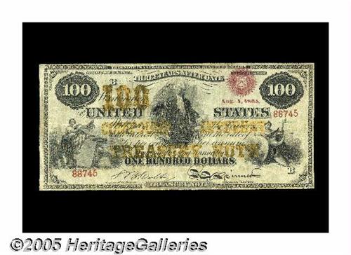 <B>Fr. 193b $100 1864 Compound Interest Treasury Note Fine.</B></I> Seventeen notes are recorded in the census, five of which are definitively counterfeit, and three others have to be considered suspicious as they have not reached the market in many years. The finest known genuine example is an Extra-Fine that we handled in 1998. The presently offered note was called "restored" when it was sold by Bowers as part of the Harry Bass Research Foundation Collection in 1999. At that sale, it realized $43,700. We have examined this note with extreme care and have found no evidence of restoration. There are a few small holes where the bronzing has eaten through the paper, and, had the note been sent to the only professional restorer capable of doing sophisticated, undetectible work, these holes would certainly be gone. In any event, if there are any restorations, they are of an extremely minor variety and we simply can't find them. Much of the metallic bronze of the overprint has flaked away over the years, but the note has avoided the corrosion that generally plagues all denominations of these heavily bronzed, Compound Interest Treasury notes. The note has an illustrious pedigree having been part of the F.C.C. Boyd Collection, the Robert Friedberg Collection, then to Harold Bareford, Robert Schermerhorn, and on to Harry Bass. This piece is well margined, solid, and most attractive for the grade. We would not be at all surprised if it far surpasses its estimate of...