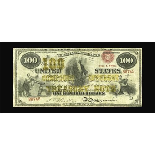 <B>Fr. 193b $100 1864 Compound Interest Treasury Note Fine.</B></I> We sold this note as part of the Jim O'Neal Collection and are pleased to have this spectacular rarity and old friend back again. Its previous description still works just fine. "Seventeen notes are recorded in the census, five of which are definitively counterfeit, and three others have to be considered suspicious as they have not reached the market in many years. The finest known genuine example is an Extra Fine that we handled in 1998. The presently offered note was called "restored" when it was sold by Bowers as part of the Harry Bass Research Foundation Collection in 1999. At that sale, it realized $43,700. We have examined this note with extreme care and have found no evidence of restoration. There are a few very minor holes where the bronzing has eaten through the paper, and, had the note been sent to the only professional restorer capable of doing sophisticated, undetectible work, these holes would certainly be gone. In any event, if there are any restorations, they are of an extremely minor variety and we simply can not find them. Much of the metallic bronze of the overprint has flaked away over the years, but the note has avoided the corrosion that generally plagues all denominations of these heavily bronzed Compound Interest Treasury notes. The note has an illustrious pedigree having been part of the F.C.C. Boyd Collection, the Robert Friedberg Collection, then to Harold Bareford, Robert Schermerhorn, and on to Harry Bass. This piece is well margined, solid, and most attractive for the grade. We would not be at all surprised if it far surpasses its estimate of..."