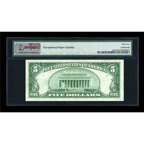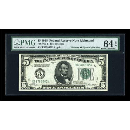 <B>Fr. 1950-E $5 1928 Federal Reserve Note. PMG Choice Uncirculated 64 EPQ.</B></I><BR> The Richmond district is one of the scarcer districts in this series, cataloguing for $750 in the new Schwartz & Lindquist small size reference. The Flynn collection example is not only Choice CU but carries the PMG EPQ designation as well. <BR><I>From The Thomas M. Flynn Collection</B></I><BR><BR><b>Shipping:</b> Coins & Currency (<a target="_blank" href="http://www.heritageauctions.com/common/shipping.php">view shipping information</a>)
