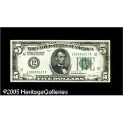 <B>Fr. 1950-L $5 1928 Federal Reserve Note. Choice Crisp Uncirculated.</B></I><BR>Low serial number L00000027A, one of the very few low numbers we've had to offer from this district. Lot:15879