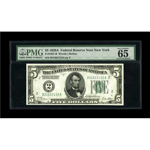<B>Fr. 1951-B $5 1928A Federal Reserve Note. PMG Gem Uncirculated 65 EPQ.</B></I><BR>This is the first of two gorgeous New York Fives that have consecutive serial numbers.<BR><BR><b>Shipping:</b> Coin/Currency (<a target="_blank" href="http://www.heritageauctions.com/common/shipping.php">view shipping information</a>)