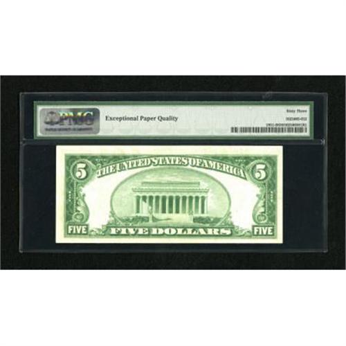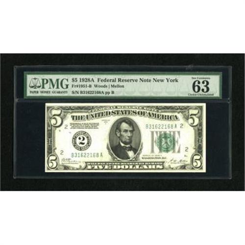 <B>Fr. 1951-B $5 1928A Federal Reserve Note. PMG Choice Uncirculated 63 EPQ.</B></I><BR> Solid paper surfaces and original embossing are on display for this scarcer early note that lists in Schwartz for $200.<BR><BR><b>Shipping:</b> Coins & Currency (<a target="_blank" href="http://www.heritageauctions.com/common/shipping.php">view shipping information</a>)