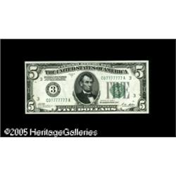 <B>Fr. 1951-C $5 1928A Federal Reserve Note. Choice Crisp Uncirculated.</B></I><BR>One of the very few fancy numbers reported in this series, with this example bearing serial C07777777A. Lot:15883