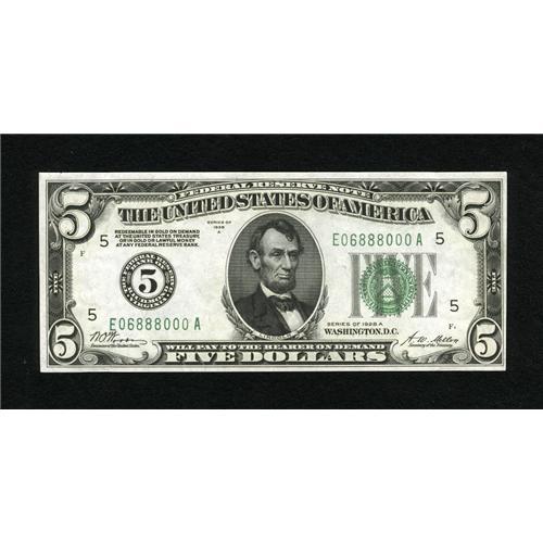 <B>Fr. 1951-E $5 1928A Federal Reserve Note. Choice Crisp Uncirculated.</B></I><BR>A strictly original example of this much scarcer numbered district series that has solid embossing and crackling fresh paper. A cute serial number E06888000A only enhances its desirability.<BR><BR><b>Shipping:</b> Coins & Currency (<a target="_blank" href="http://www.heritageauctions.com/common/shipping.php">view shipping information</a>)
