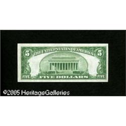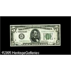 <B>Fr. 1951-F* $5 1928A Federal Reserve Note. About Uncirculated.</B></I><BR>No star numbers are listed in the new Oakes reference from this very rare district. This example is flat and appears new but a center fold can be observed without much trouble. A tiny repaired split and a couple of miniscule rust flecks in the top margin are also noted for total accuracy in cataloguing. Lot:15885