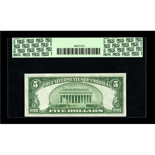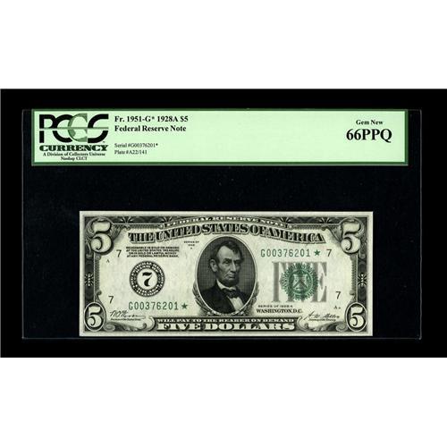 <B>Fr. 1951-G* $5 1928A Federal Reserve Note. PCGS Gem New 66PPQ.</B></I><BR>This is a tougher series to get regular notes from let alone replacements. Simply a pristine piece of small size currency.<BR><I>From The Bill and Kathy Stella Currency Collection</B></I><BR><BR><b>Shipping:</b> Coin/Currency (<a target="_blank" href="http://www.heritageauctions.com/common/shipping.php">view shipping information</a>)