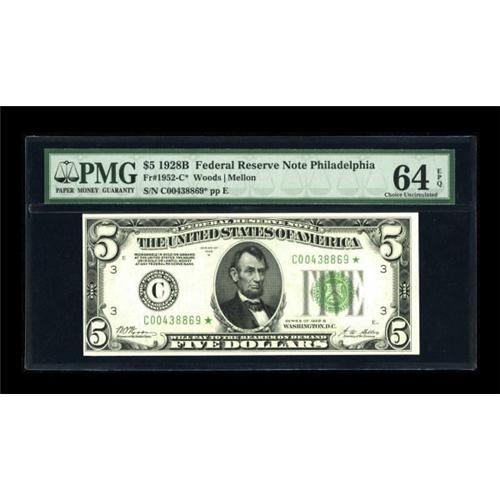 <B>Fr. 1952-C* $5 1928B Federal Reserve Note. PMG Choice Uncirculated 64 EPQ.</B></I><BR> A mere six examples of this scarce star have made appearances in our auctions. The nicest pieces, including this pleasingly original specimen, are all from the same small serial number run.<BR><BR><b>Shipping:</b> Coins & Currency (<a target="_blank" href="http://www.heritageauctions.com/common/shipping.php">view shipping information</a>)