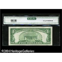 Fr. 1952-E $5 1928-B Federal Reserve Note. CGA Gem Unci <B>Fr. 1952-E $5 1928-B Federal Reserve Note. CGA Gem Uncirculated 66.</B></I><BR>It would be hard to improve on this third-party graded beauty. <BR><BR><B>Important notice:</B> Heritage usually auctions material at the rate of 200-250 lots per hour. On some occasions eBay Live bid software or the Internet may not be able to keep up with the pace of the auction. We recommend placing a realistic absentee bid now as insurance to avoid disappointment. Occasionally the auctioneer may eliminate or reject an eBay Live bid, and the auctioneer may also reopen a lot after the close of the eBay live bidding (usually because we missed an audience bid), and may reject your bid even if it shows you as the winning bidder. By bidding via eBay Live, you agree that Heritage may award the lot to another bidder at its sole discretion under the circumstances described above or any other reasonable circumstances. Since eBay bids are not shown to us until we open the lot on the floor, we treat those bids just like floor bids. In most cases the floor responds before the eBay bid is presented to us, due to Internet lag time, so for consistency we have made it a policy that floor bids are always considered first over tie eBay live bids. Also please note that all Heritage lots purchased through eBay Live carry a 20% Buyer's Premium. Please make sure you read the Terms and Conditions before you bid. This lot is being auctioned in conjunction with a live floor auction by Heritage Galleries & Auctioneers. All final auction and invoice information will be supplied by Heritage Galleries & Auctioneers, and all other information should be considered preliminary. Lot:16336