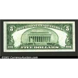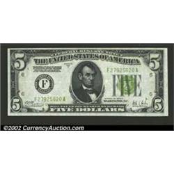 Fr. 1953-F $5 1928C Federal Reserve Note. Extremely Fine. An extremely scarce issue, and a note that is likely to see spirited bidding. A very light horizontal bend is present in addition to three vertical folds, but the note is bright and crisp and is too nice to be called anything less than Extremely Fine.