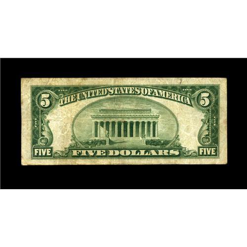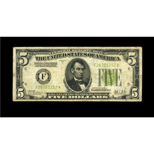<B>Fr. 1953-F $5 1928C Federal Reserve Note. Fine.</B></I><BR>This is a tough, well margined note from a hard to locate series that is key to the small size $5 FRN collection.
