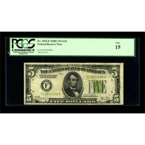 <B>Fr. 1953-F $5 1928C Federal Reserve Note. PCGS Fine 15.</B></I><BR> A moderately circulated but totally problem free example of this very scarce series that appears to be a full grade better from the back.<BR><BR><b>Shipping:</b> Coins & Currency (<a target="_blank" href="http://www.heritageauctions.com/common/shipping.php">view shipping information</a>)