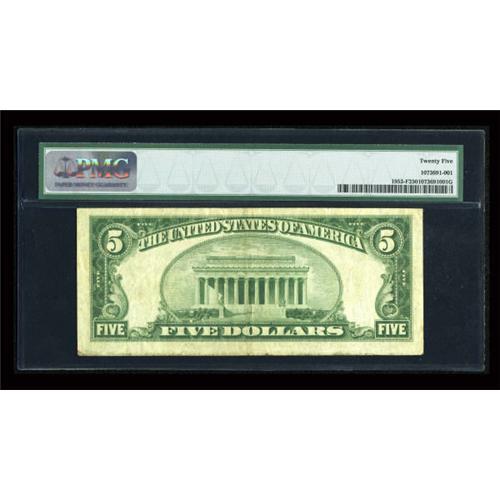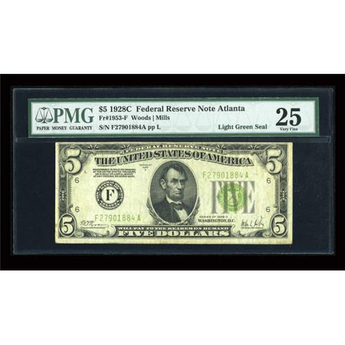 <B>Fr. 1953-F $5 1928C LGS Federal Reserve Note. PMG Very Fine 25.</B></I><BR> This is a perfectly original example of this scarce issue. Just a hair over 2 million notes from this short-lived series were printed from the Atlanta district, and only a tiny fraction of that number have survived for today's collectors. <BR><BR><b>Shipping:</b> Coins & Currency (<a target="_blank" href="http://www.heritageauctions.com/common/shipping.php">view shipping information</a>)