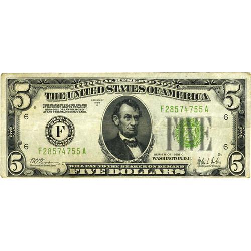 <B>Fr. 1953-F $5 1928C Federal Reserve Note. Very Fine.</B></I><BR>The paper is still crisp on this pleasing mid grade example from the tougher Atlanta district.