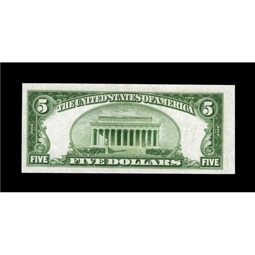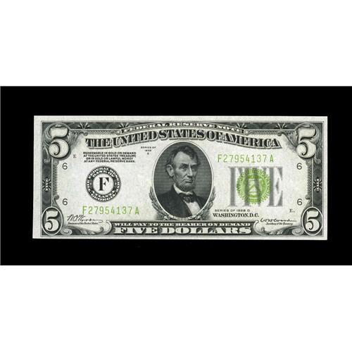<B>Fr. 1954-F $5 1928-D Federal Reserve Note. Choice Crisp Uncirculated.</B></I><BR>An attractive and brightly colored example of the key piece to the $5 Federal Reserve Note series, as 1928D examples were printed only for the Atlanta district and in very small quantities. The Oakes catalogue value in CU is $5000, which is likely to be reached here.