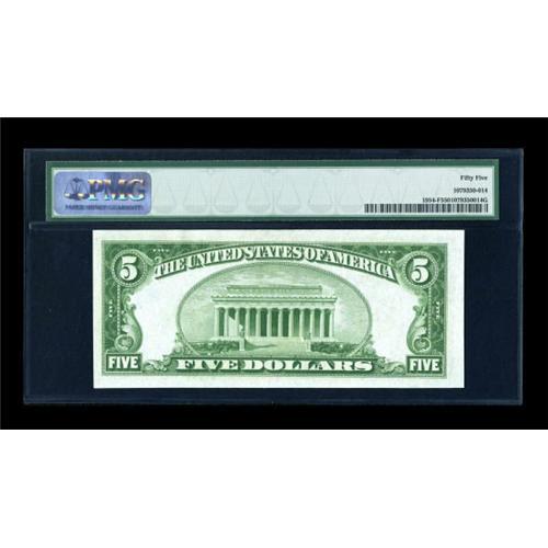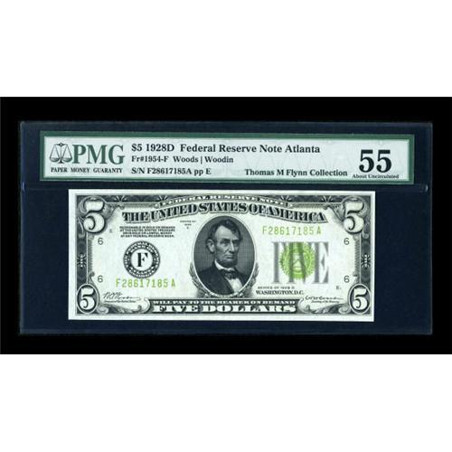 <B>Fr. 1954-F $5 1928D Federal Reserve Note. PMG About Uncirculated 55.</B></I><BR> This note is one of the keys to the $5 Federal Reserve Note series, having been issued only by the Atlanta district for a very short time during the depths of the Depression. This bright and attractive example looks new through the third party holder. <BR><I>From The Thomas M. Flynn Collection</B></I><BR><BR><b>Shipping:</b> Coins & Currency (<a target="_blank" href="http://www.heritageauctions.com/common/shipping.php">view shipping information</a>)