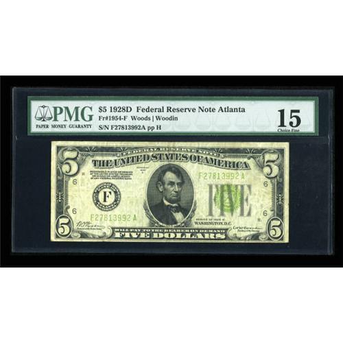 <B>Fr. 1954-F $5 1928D Federal Reserve Note. PMG Choice Fine 15.</B></I><BR> Only Atlanta issued $5s for this series that was released during the depths of the Great Depression. In fact the Treasury officers of Woods and Woodin were only in office together for less than three months. These actions resulted in the toughest series for this denomination and type. This note is solid for the grade and would complete a $5 FRN set.<BR><BR><b>Shipping:</b> Coins & Currency (<a target="_blank" href="http://www.heritageauctions.com/common/shipping.php">view shipping information</a>)