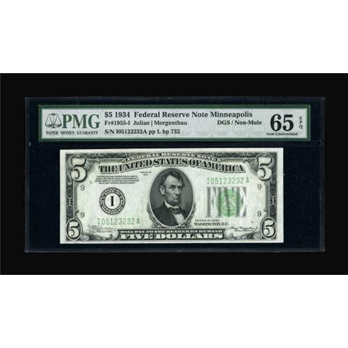 <B>Fr. 1955-I $5 1934 DGS Non-Mule Federal Reserve Note. PMG Gem Uncirculated 65 EPQ.</B></I><BR> A well margined example from the tougher Minneapolis district.<BR><BR><b>Shipping:</b> Coins & Currency (<a target="_blank" href="http://www.heritageauctions.com/common/shipping.php">view shipping information</a>)