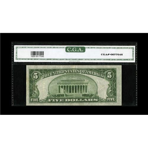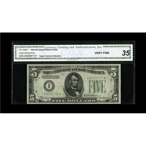 <B>Fr. 1956-I* $5 1934 Mule Federal Reserve Note. CGA Very Fine 35.</B></I><BR>This scarce replacement note note that carries Back Plate 1443 becomes the lowest serial number in the Oakes guide.