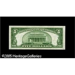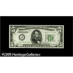 <B>Fr. 1956-J* $5 1934 Mule Federal Reserve Note. Gem Crisp Uncirculated.</B></I><BR>The impressions of the serial numbers and seal are cavernously deep on this attractive Kansas City Mule Star.<BR><I>Acquired from Harry Jones.</B></I> Lot:15917