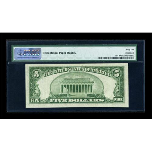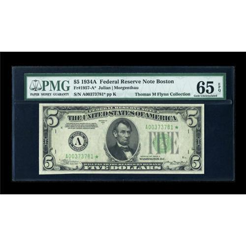 <B>Fr. 1957-A* $5 1934A Federal Reserve Note. PMG Gem Uncirculated 65 EPQ.</B></I><BR> A tougher star in an exceptionally nice grade. <BR><I>From The Thomas M. Flynn Collection</B></I><BR><BR><b>Shipping:</b> Coins & Currency (<a target="_blank" href="http://www.heritageauctions.com/common/shipping.php">view shipping information</a>)