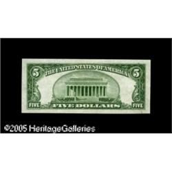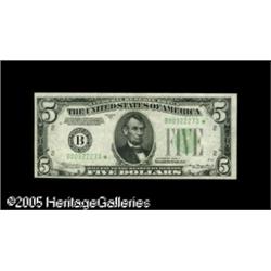 <B>Fr. 1957-B* $5 1934A Federal Reserve Note. Choice About Uncirculated.</B></I><BR>An example which has previously been sold as Choice Crisp Uncirculated, but is kept from that status by ghostly horizontal and vertical bends which are quite challenging to detect. Likely to sell for a premium above levels which might be implied by its purely technical grade. Lot:15920