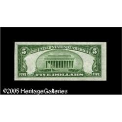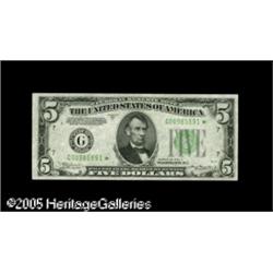 <B>Fr. 1957-G* $5 1934A Federal Reserve Note. Choice About Uncirculated.</B></I><BR>An otherwise Gem note with just a ghost of the lightest center bend keeping it from that higher grade. Likely to sell for a premium above its technical grade. Lot:15922