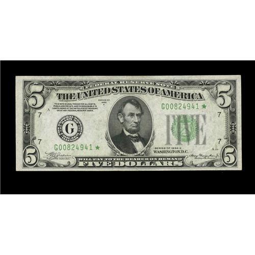 Fr. 1957-G* $5 1934A Federal Reserve Star Note. Choice Fr. 1957-G* $5 1934A Federal Reserve Star Not