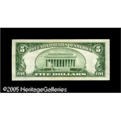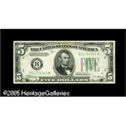 <B>Fr. 1958-B* $5 1934B Federal Reserve Note. Choice About Uncirculated.</B></I><BR>This well centered note is only the faintest of center bend from a higher grade. With the current Oakes-Schwartz catalog now valuing this issue at $600 in CU, this example will likely sell in the range of... Lot:15926