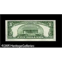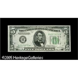 <B>Fr. 1959-B* $5 1934C Federal Reserve Note. Choice Crisp Uncirculated.</B></I><BR>The paper is fresh and crackly with especially deep and pronounced serial number and seal impressions. Two as made paper wrinkles are noted at left below the district seal. Lot:15931
