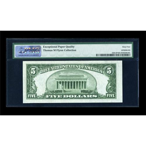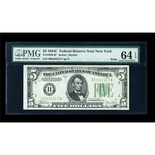 <B>Fr. 1959-B* $5 1934C Wide Federal Reserve Note. PMG Choice Uncirculated 64 EPQ.</B></I><BR> A nice star which makes a perfect example to cover this series. <BR><I>From The Thomas M. Flynn Collection</B></I><BR><BR><b>Shipping:</b> Coins & Currency (<a target="_blank" href="http://www.heritageauctions.com/common/shipping.php">view shipping information</a>)