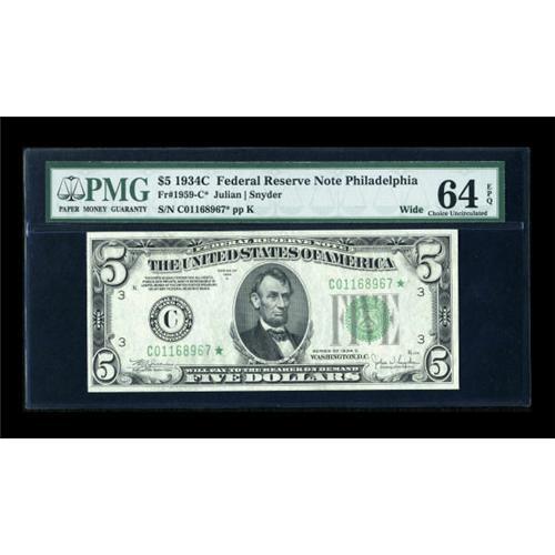 <B>Fr. 1959-C* $5 1934C Wide Federal Reserve Note. PMG Choice Uncirculated 64 EPQ.</B></I><BR> A fully original example of a tougher star, with PMG bestowing its coveted EPQ designation. <BR><I>From The Thomas M. Flynn Collection</B></I><BR><BR><b>Shipping:</b> Coins & Currency (<a target="_blank" href="http://www.heritageauctions.com/common/shipping.php">view shipping information</a>)