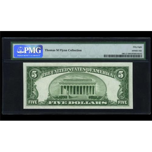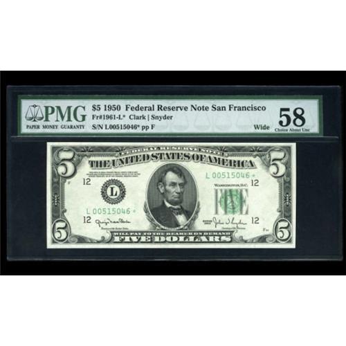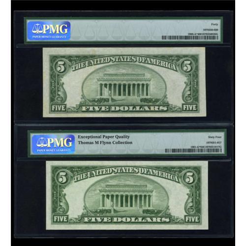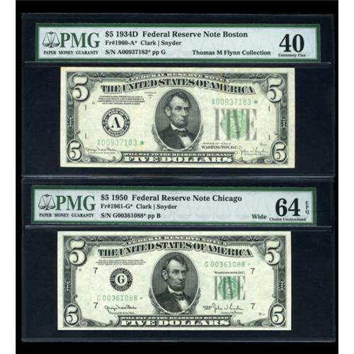 <B>Fr. 1960-A* $5 1934D Federal Reserve Note. PMG Extremely Fine 40;<BR>Fr. 1961-G* $5 1950 Wide Federal Reserve Note. PMG Choice Uncirculated 64EPQ; Fr. 1961-L* $5 1950 Wide Federal Reserve Note. PMG Choice About Uncirculated 58.</B></I><BR> This is a trio of early $5 Fed replacement notes that range from lightly circulated to the choice grade as vouched for by PMG.<BR><I>From The Thomas M. Flynn Collection</B></I><BR><BR><b>Shipping:</b> Coins & Currency (<a target="_blank" href="http://www.heritageauctions.com/common/shipping.php">view shipping information</a>)