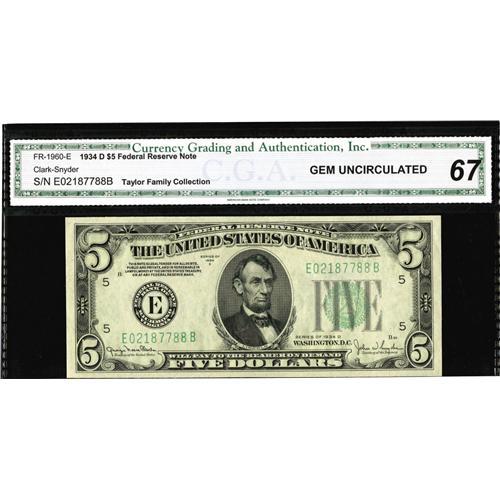 <B>Fr. 1960-E $5 1934D Federal Reserve Note. CGA Gem Uncirculated 67.</B></I><BR>Broad margins are seen on this note from the Taylor Family Collection.