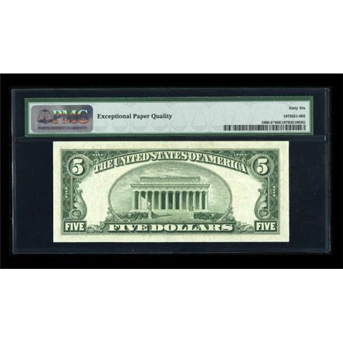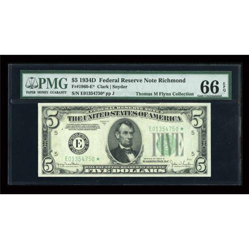 <B>Fr. 1960-E* $5 1934D Federal Reserve Note. PMG Gem Uncirculated 66 EPQ.</B></I><BR> A beautifully centered and totally original example which is only the second 1934D Richmond star to be graded by PMG, with the other only AU. This Gem may well be the finest known for many years to come.<BR><I>From The Thomas M. Flynn Collection</B></I><BR><BR><b>Shipping:</b> Coins & Currency (<a target="_blank" href="http://www.heritageauctions.com/common/shipping.php">view shipping information</a>)