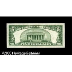 <B>Fr. 1960-F $5 1934D Federal Reserve Note. Choice Crisp Uncirculated.</B></I><BR>A fresh and well centered example of this extremely scarce and sought after note. Only the presence of the barest of handling indications compels us to classify this lovely note as Choice rather than Gem.<BR><I>Acquired from First City Currency.</B></I> Lot:15938