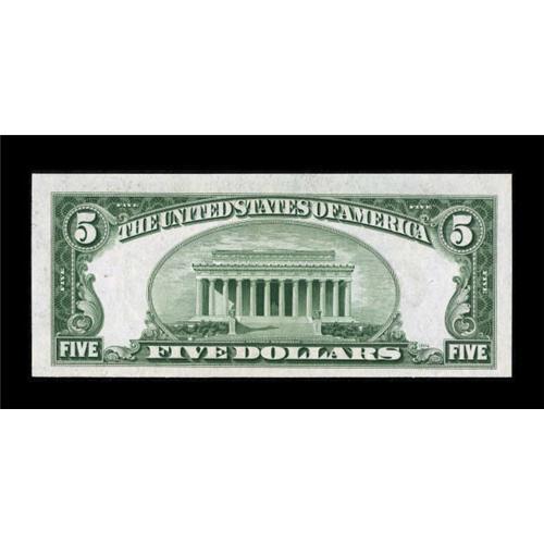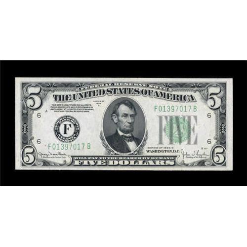<B>Fr. 1960-F $5 1934D Federal Reserve Note. Choice Crisp Uncirculated.</B></I><BR> This is the key piece to any district set, with the F-B block somewhat more difficult to obtain than the F-A. The face centering is near perfect here, but the back is just a touch low. <BR><I>From The Thomas M. Flynn Collection</B></I><BR><BR><b>Shipping:</b> Coins & Currency (<a target="_blank" href="http://www.heritageauctions.com/common/shipping.php">view shipping information</a>)