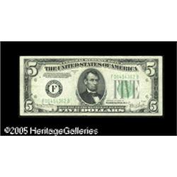 <B>Fr. 1960-F $5 1934D Federal Reserve Note. Extremely Fine.</B></I><BR>Light folds are found on this scarce $5 block that is on many want lists. Lot:15940