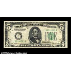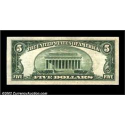 Fr. 1960-F $5 1934D Federal Reserve Note. Extremely Fine-About Uncirculated.This district has proved to be the key to this series, with the small issue here divided into two blocks, both rare. This one is catalogued at $350 in VF and $2000 in CU in the new Oakes reference, and this barely circulated example is a lot closer to CU than VF. Important notice: We expect to be auctioning lots at the rate of 200-250 per hour. Sometimes eBay Premier live bid software cannot keep up with that pace, so we strongly recommend that you place a realistic proxy bid now as insurance to avoid disappointment. Also please note that all Heritage/CAA lots purchased through eBay Premier carry a 20% Buyer's Premium. Please make sure you read the Terms and Conditions.