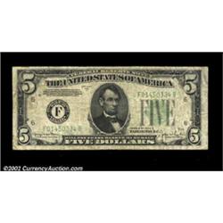 Fr. 1960-F $5 1934D Federal Reserve Note. Fine-Very Fine.A nice evenly circulated example of the rare F-B block. Important notice: We expect to be auctioning lots at the rate of 200-250 per hour. Sometimes eBay Premier live bid software cannot keep up with that pace, so we strongly recommend that you place a realistic proxy bid now as insurance to avoid disappointment. Also please note that all Heritage/CAA lots purchased through eBay Premier carry a 20% Buyer's Premium. Please make sure you read the Terms and Conditions.